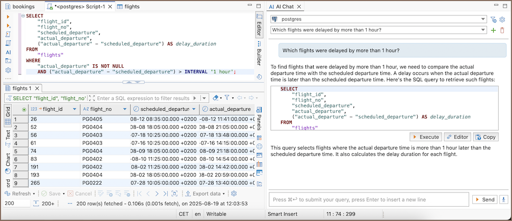 Team Edition provides AI Chat for working with databases in natural language. You can enter requests in plain text to generate SQL queries, get explanations, or ask questions about your databases.