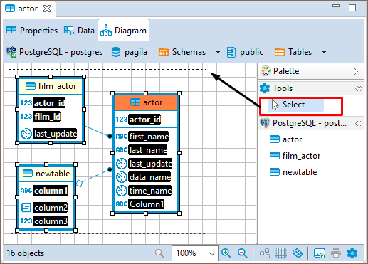 - Rearrange tables in the diagram by dragging them all over the space. You can select several tables and drag them to a new location.