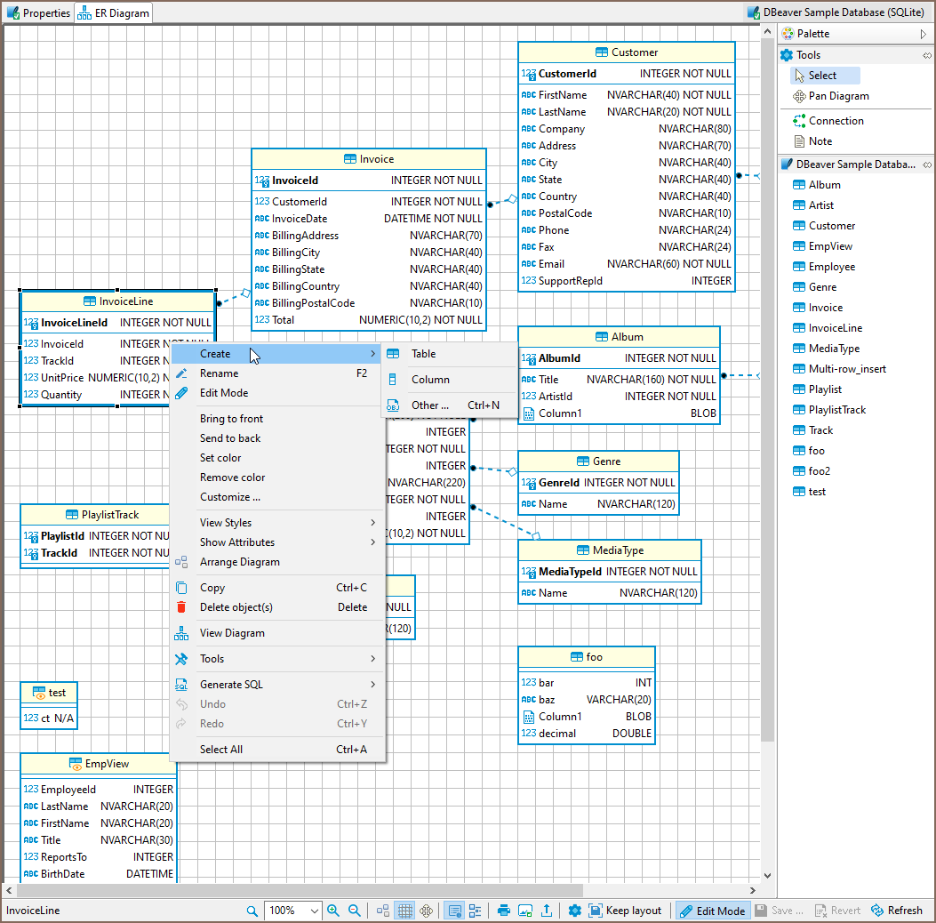 Edit mode for Diagrams is a special feature that lets you create database objects while using the visual presentation of ER Diagrams. It can be accessed on the ERD tab of any database object that supports it. Changes made to a diagram in edit mode will generate an SQL script that can be executed to persist all the changes made. You can enable Edit mode by either choosing it from the context menu or by clicking a button on the bottom toolbar.
