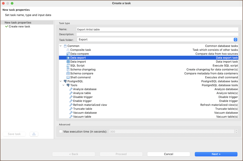 Field Description Name Enter a unique name for the task. Description (Optional) Add a short description to help identify the task later. Task folder (Optional) Select a folder to organize tasks. Task type Choose the tool you want to automate. Select from the list of task types: Common: Available for any database type. Database-specific: Available only for supported database types. Max execution time (in seconds) (Optional) Set a time limit for task execution. Default is 300.Note