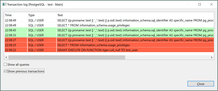 To see all previous transactions during the current session, select the Show previous transactions checkbox. To see all queries including non-transactional ones, select the Show all queries checkbox.