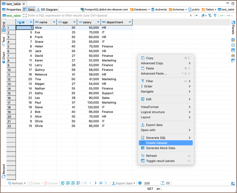 You can also create a new Dataset from the Result tab of the SQL Editor. Run the query you need, right-click inside Result tab window, and choose the Create Dataset option.