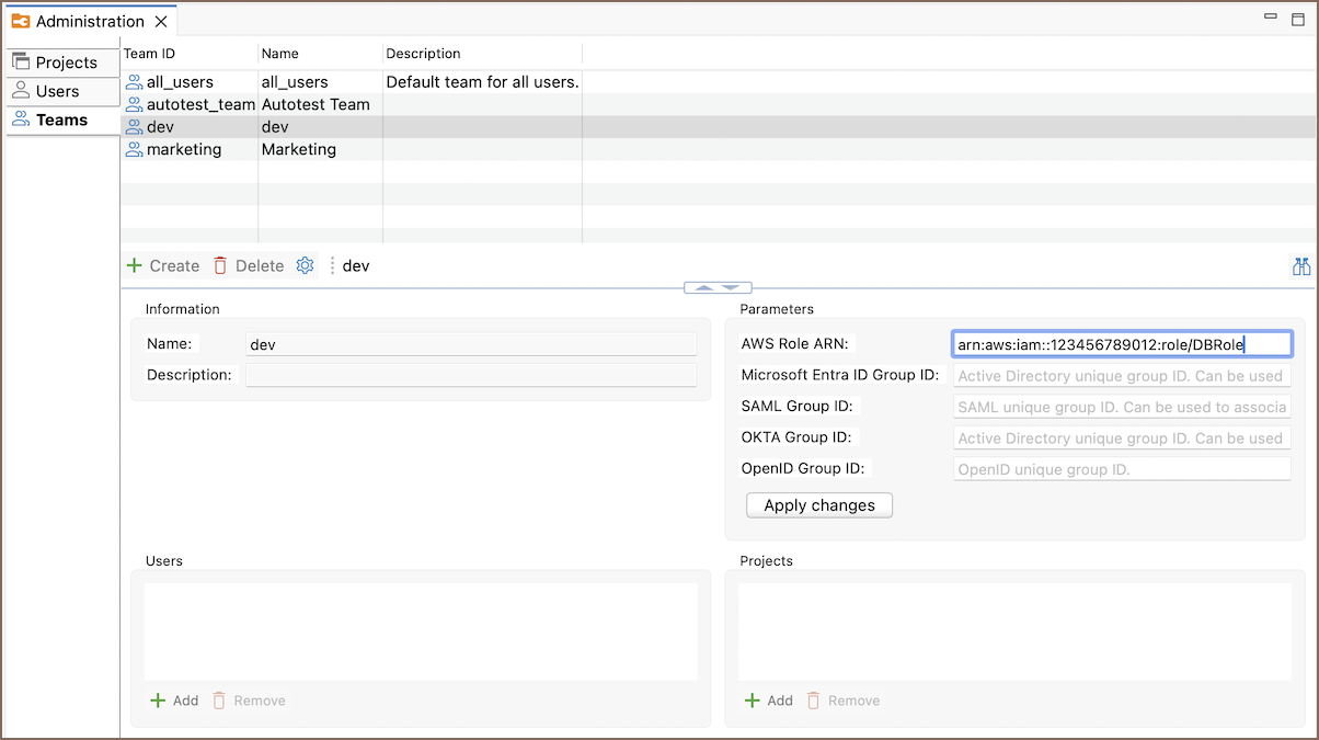 - Incorrect group ID: The value in Team parameters must exactly match the one sent in the token. Display names usually won’t work—use raw IDs (e.g., UUID, ARN).