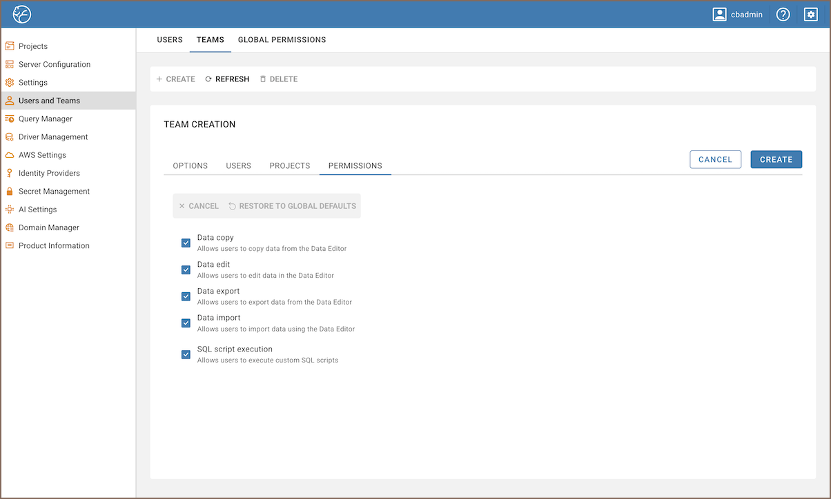 In the Permissions tab (available only in the Web client), administrators can control what actions Team members are allowed to perform in the Data Editor and SQL Editor.