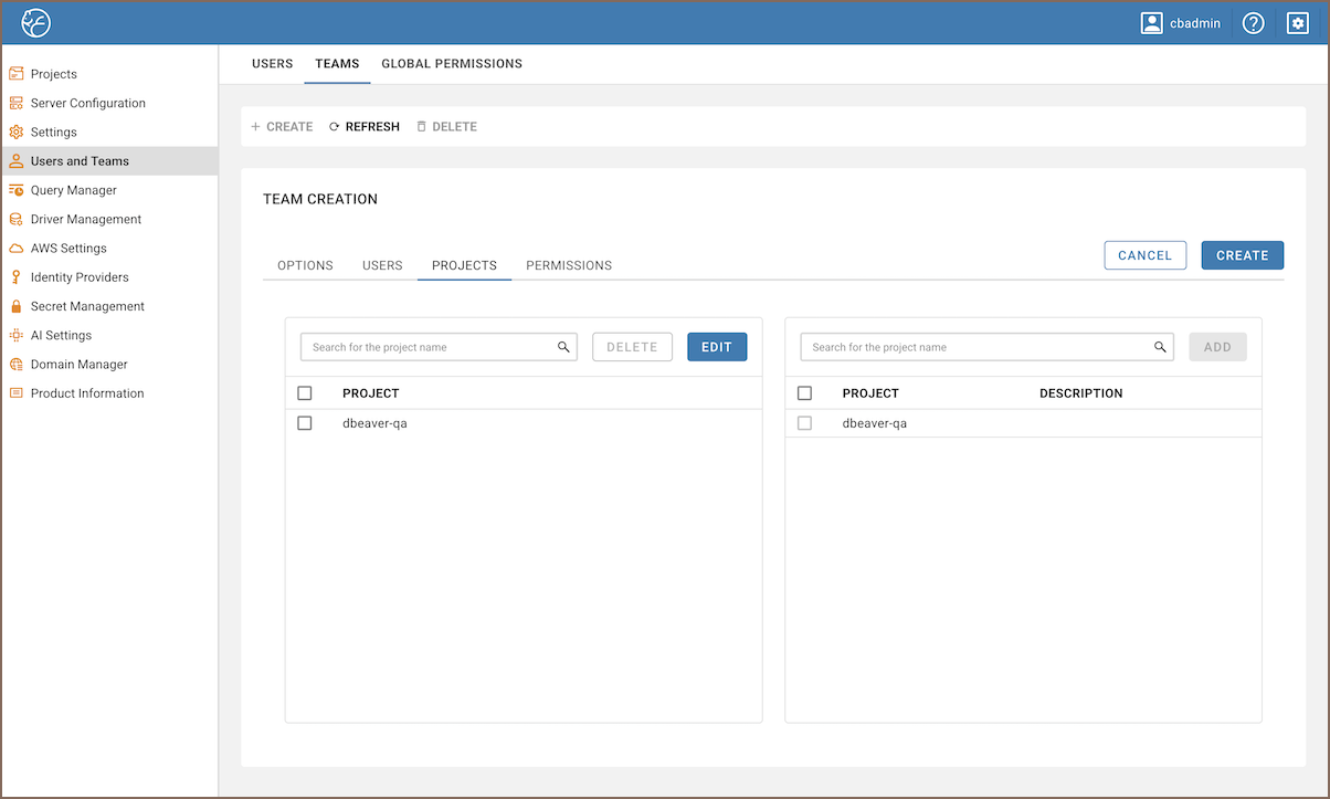 In the Projects tab, administrators can manage which projects are available to the Team: