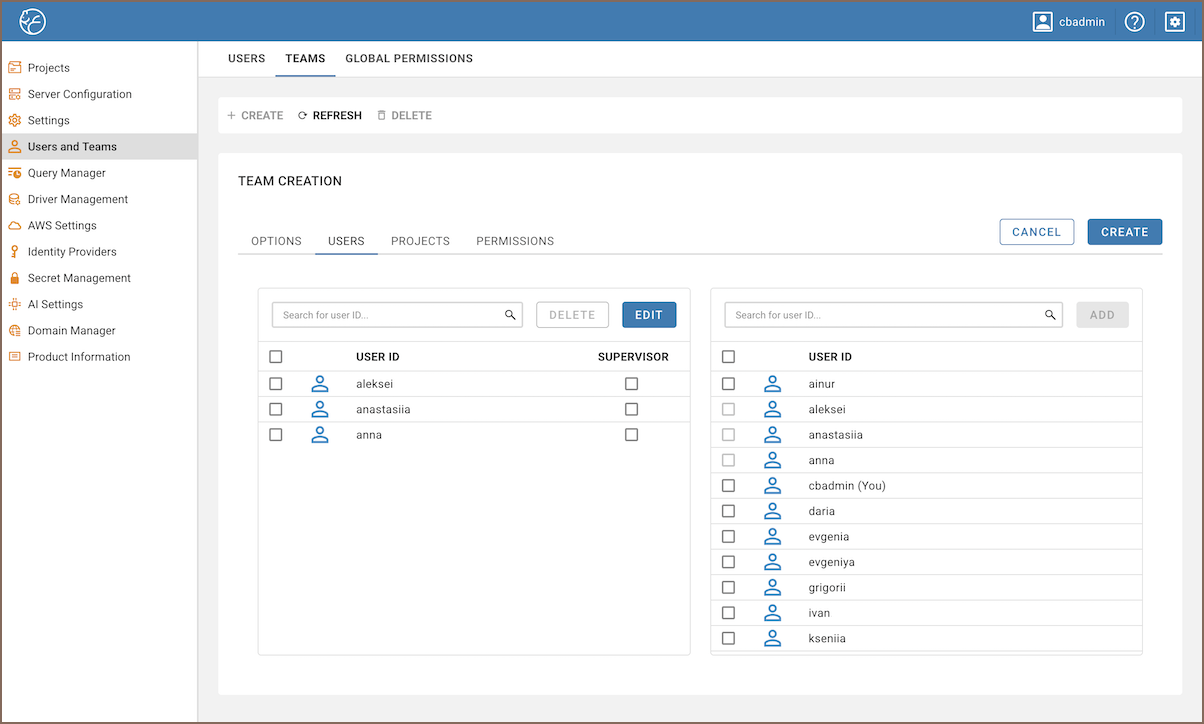 - To add a user to the Team, click Edit, select the desired users, and then click Add.