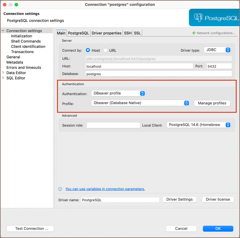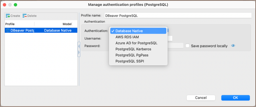 - From the Authentication dropdown menu, select the DBeaver profile method.