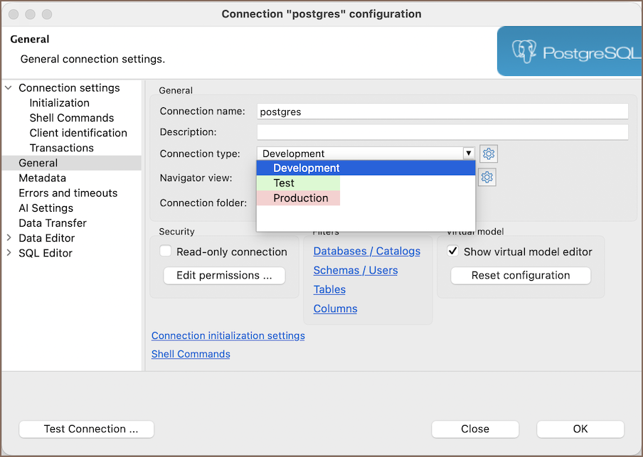 You can assign a connection type when creating or editing a connection. You can also define your own types with custom settings and colors. Connection type colors appear in the Database Navigator, all related editors and tabs.
