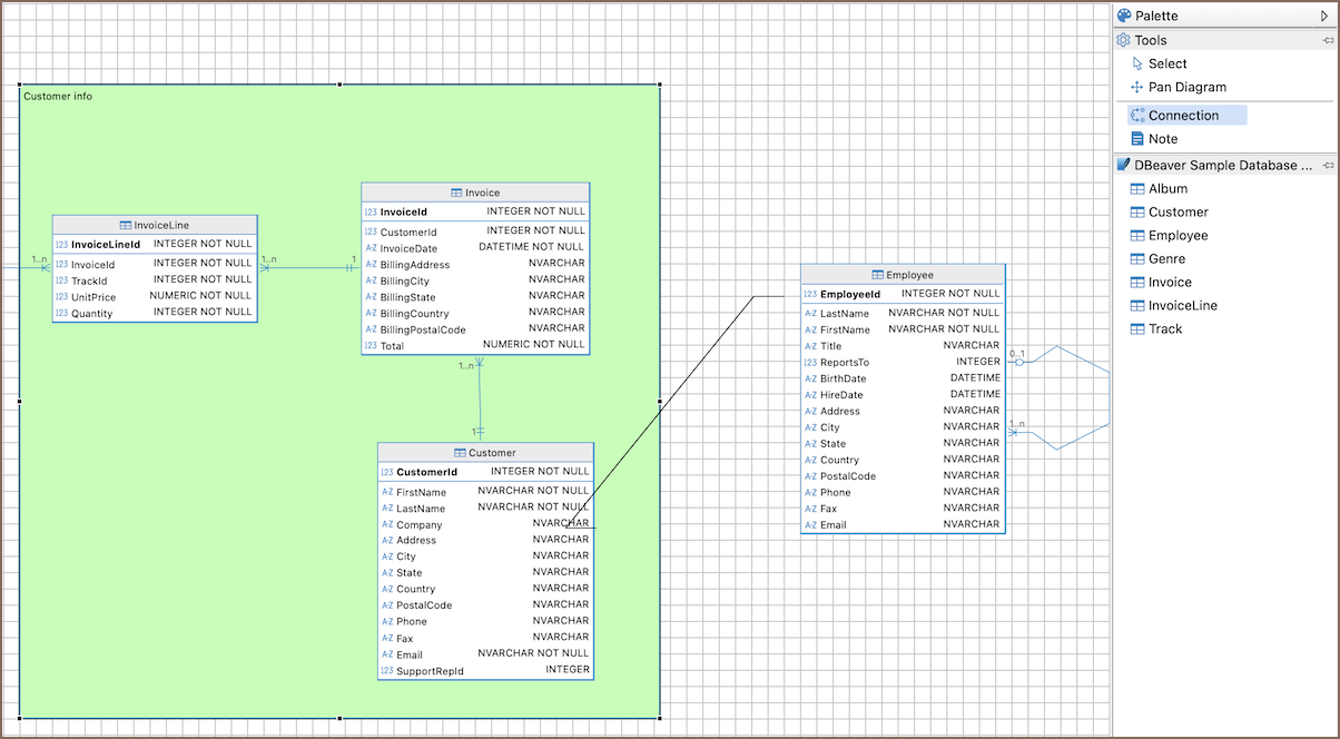 To add tables to a custom diagram, drag database objects from the Database Navigator and drop them onto the diagram canvas.
