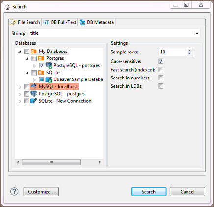 The Search button is enabled only when you select the right level of checkboxes – database connections or lower nodes.