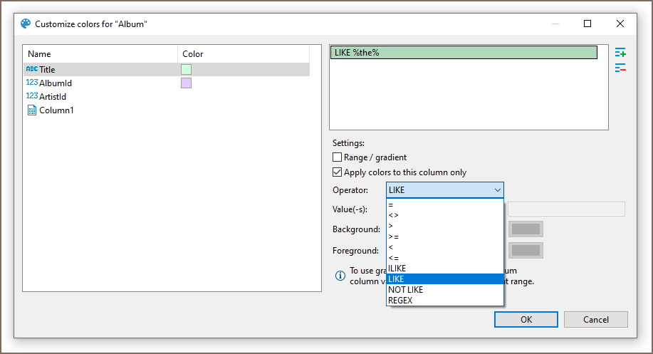 | Apply colors to this column only | Restricts the color rule to the selected column. |
