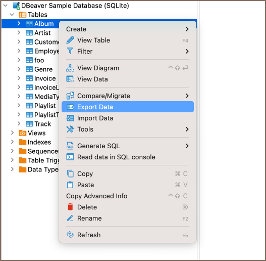 Select the table or tables you want to export. In the context menu, choose Export Data.