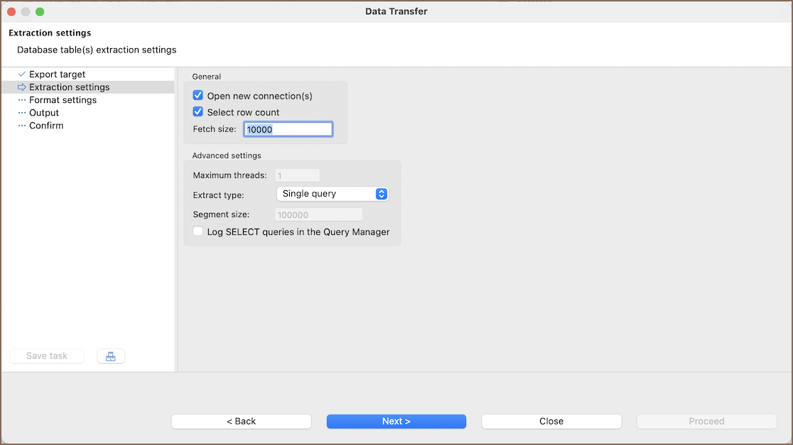 Setting name Description Maximum threads Number of threads used for data extraction. Extract type Defines the method of data extraction ( Single queryorMultiple queries).Segment size The size of data segments to be extracted at a time (active while Multiple queries are selected as an Extract type). Open new connection(s) Opens a new physical connection for data reading, recommended if you plan to continue working with the database during the export process. Select row count Queries row count before performing export to track progress, but may cause performance issues in some cases. Fetch size Number of rows the driver retrieves in one batch from the database. Log SELECT queries Records all SELECTqueries in the Query Manager (disabled by default). This may slow data transfer and increase the size of the Query Manager database.Tip