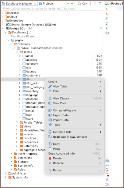 Right-click an object in the Database Navigator tree to open its context menu. The menu shows different items depending on the database type and selected object.
