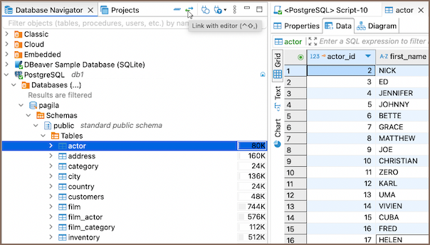 | Link with editor | Syncs the selected item in active editor with schema in the Database Navigator. | |