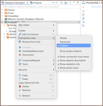 Switch between Simple, Advanced, or Custom view to control how much detail is shown in Database Navigator.