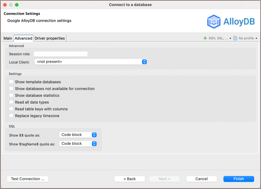 The Advanced tab of the connection settings offers additional options that allow you to customize your further connection to the AlloyDB database.