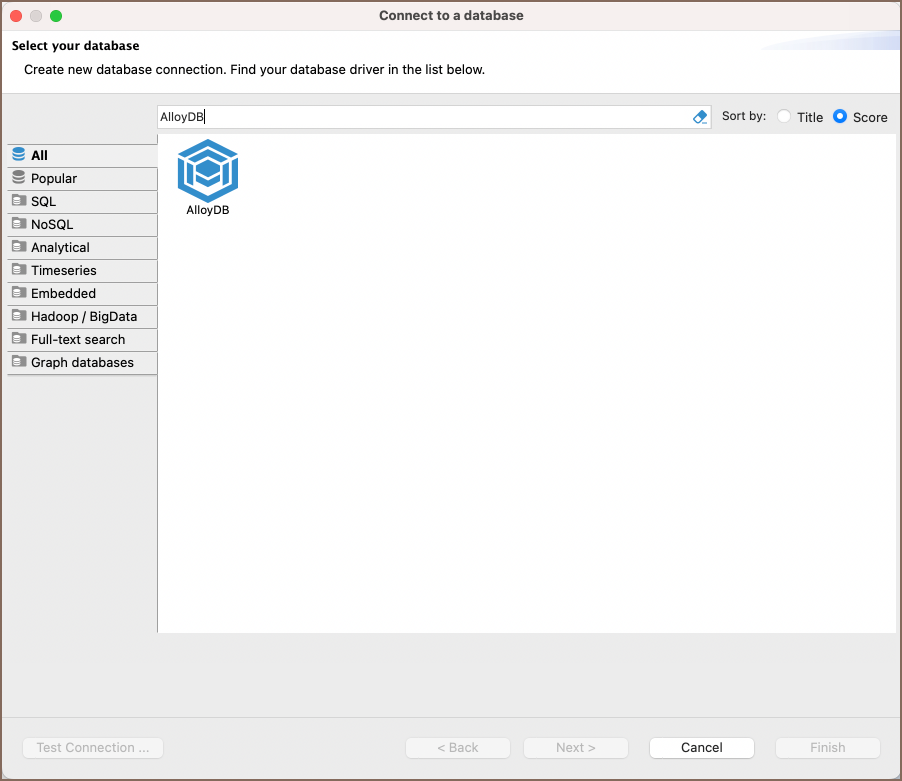 Field Description Connect by (Host/URL) Choose whether you want to connect using a host or a URL. Driver Type Select the appropriate driver for your AlloyDB database. URL If you are connecting via URL, enter the URL of your AlloyDB database here. This field is hidden if you are connecting via the host. Host If you are connecting via host, enter the host address of your AlloyDB database here. Database Enter the name of the AlloyDB database you want to connect to. Show all databases Displays all databases in the database navigator.