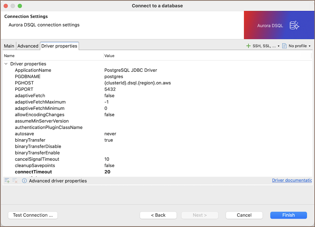 Use the Driver properties tab to fine-tune how the JDBC driver connects to Aurora DSQL.
