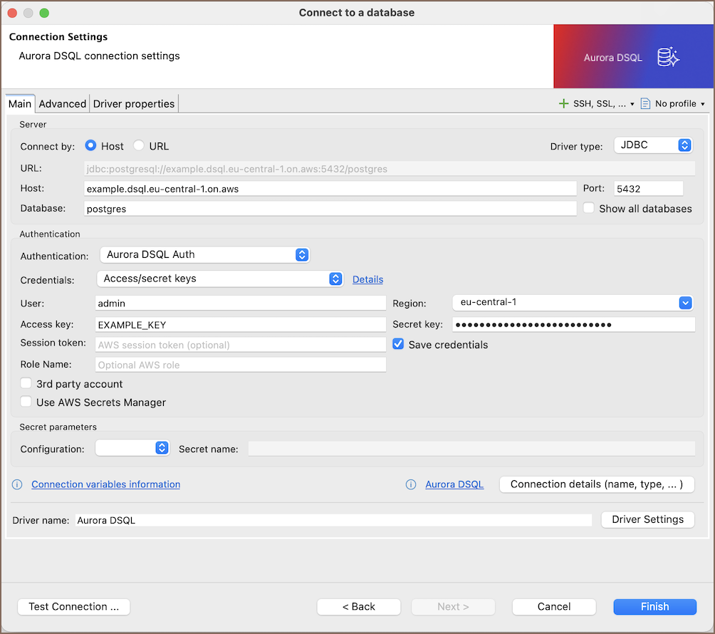 | Database | Enter the name of the Aurora DSQL database you want to connect to. |