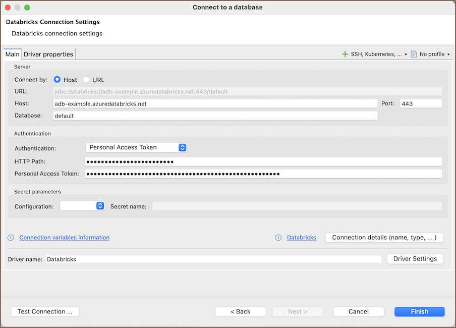 In this subsection, we will outline the settings for establishing a direct connection to a Databricks database using Team Edition. Correctly configuring your connection ensures seamless interaction between Team Edition and your Databricks database.