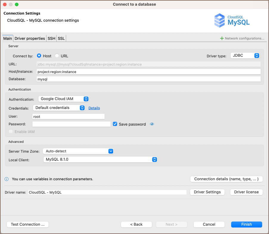 | Driver Type | Select the appropriate driver for your Google Cloud MySQL database. |