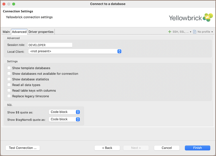 The Advanced tab of the connection settings offers additional options that allow you to customize your further connection to the Yellowbrick database.