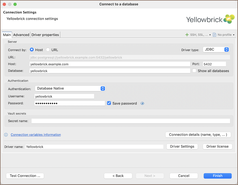 - Yellowbrick OAuth2Connection Details Provide additional connection details if necessary. Driver Name This field will be auto-filled based on your selected driver type. Driver Settings If there are any specific driver settings, configure them here. -