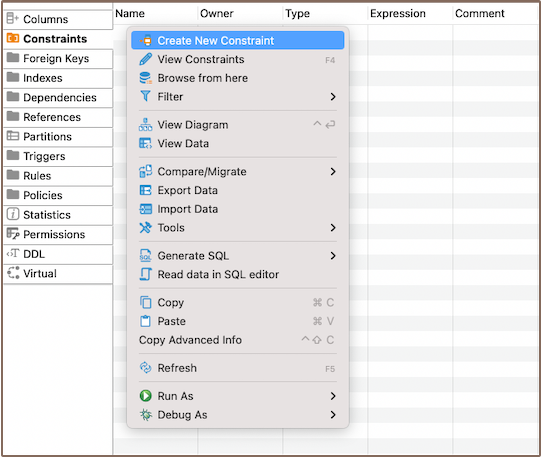 • Using the Database Navigator: Navigate to the database where the table you want to add a constraint to is located. Find and select the table for which you want to create a new constraint. Within the selected table, you'll find a folder named Constraints.
