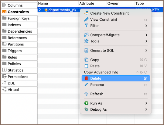 • Using the Database Navigator: Navigate to the database where the table with the constraint is located. Find and select the constraint, open the Constraints folder, and find the constraint you want to delete.