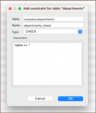 For instance, suppose you have a column named "name" and you want to ensure that its value is never an empty string. You could create a check expression as follows: