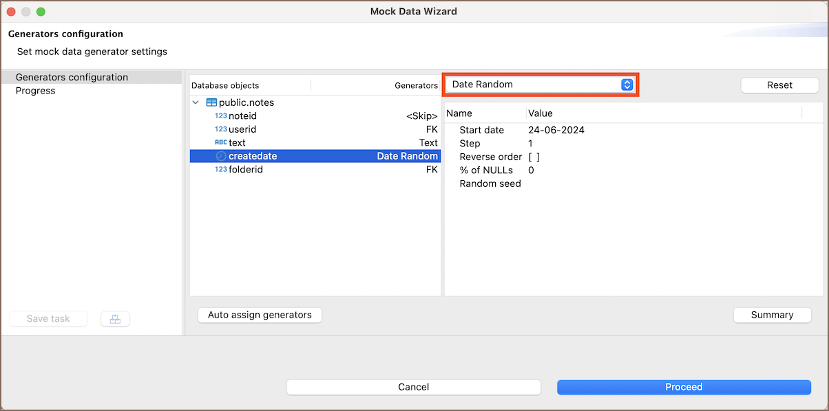 After configuring the initial settings, select a column in the table. Use the dropdown menu to choose the desired generator for each column according to your needs. Refer to the specific parameters section for detailed configuration options for each generator type.