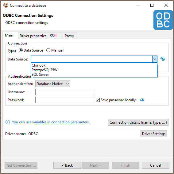 To do so, open existing connection and choose ODBC as the driver type from the drop-down menu:
