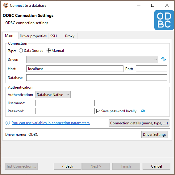 If you want to use an ODBC driver directly and manually configure connection parameters, switch to Manual connection type and choose an appropriate driver from a drop-down menu and fill the rest of the fields according to your configuration:
