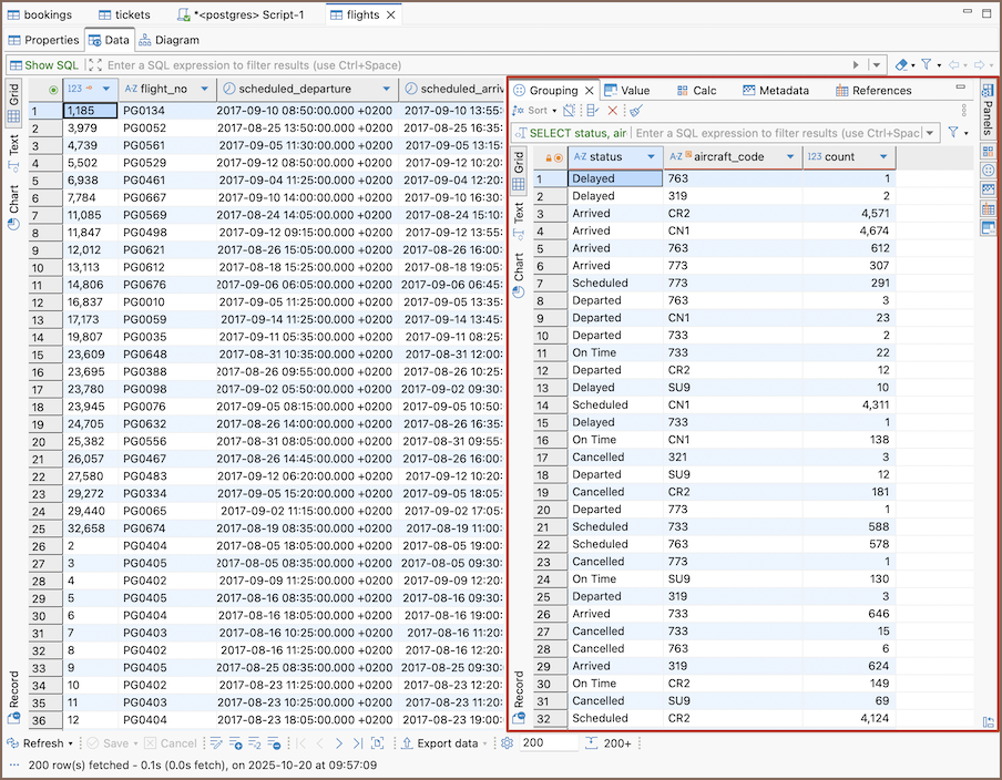 | Result details | Show query execution details such as job ID, bytes processed, and cache usage.This panel is specific to BigQuery. |