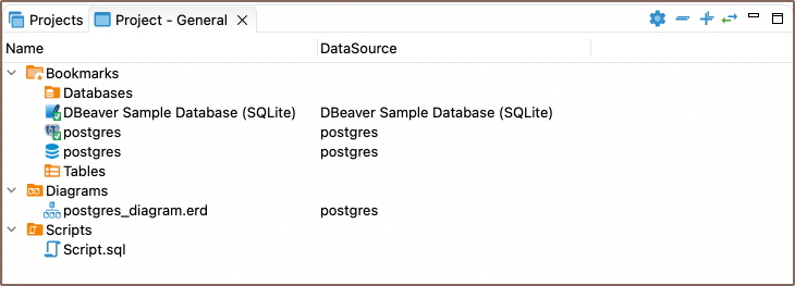 The Project Explorer displays the content of a project with metadata. The content includes: Bookmarks, Diagrams, and Scripts. The metadata appears in columns which you can hide or show.
