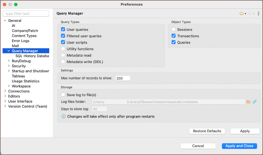 To store query logs in a file and control how many entries appear in the Query Manager, configure the settings in Window -> Preferences -> Query Manager.