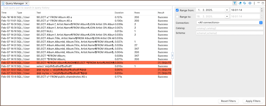 | Connection | Filters queries by a specific database connection or shows all connections. |