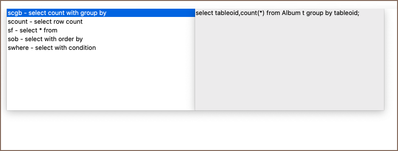 To view available templates, press Ctrl+Alt+SPACE (⌃+⌥+SPACE on macOS) or right-click within the script panel and select SQL Template from the context menu. A list of available templates will appear: