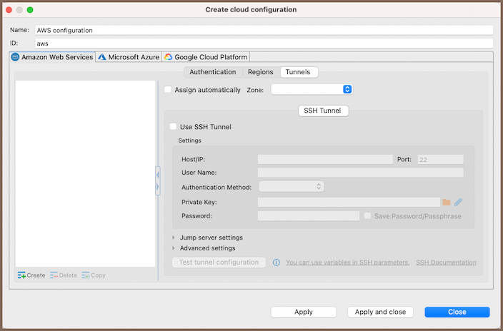 • This tab allows you to set up SSH tunnels specifically for cloud connections.