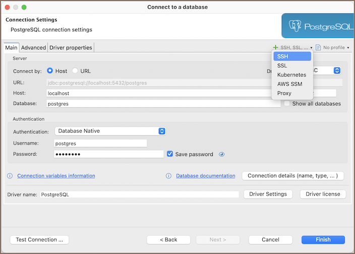 If you use URL connection then you must configure port forwarding manually. In the Advanced Settings set both Local Port and Remote Port to 5432 (database server port, 5432 is the default value for PostgreSQL). It will work in most cases. But it will fail if you have PostgreSQL server on your local machine because port 5432 is already occupied. In this case you can use any random port number for Loca Port (e.g. 15432). Use the same 5432 for Remote Port because it is real port number for remote PostgreSQL server.