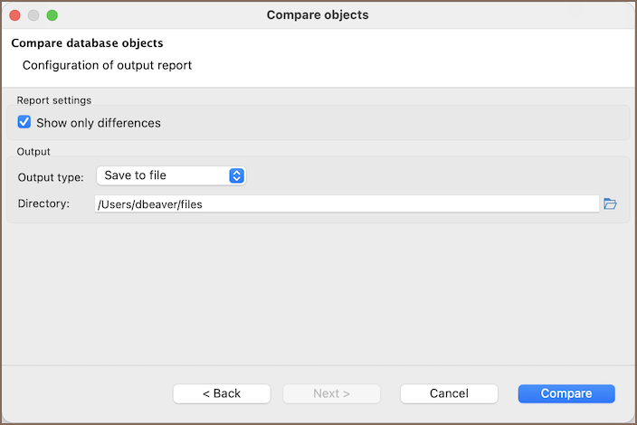 Setting Description Show only differences Filters the final report to show only objects and properties that differ. Matching entries are hidden. Output type Selects how to generate the report: open it in the browser or save an .htmlfile to a folder.Directory Folder where the HTML report is saved when file output is selected. Disabled if output type is browser. -