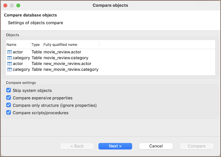 Setting Description Skip system objects Skips system objects returned by the driver. System folders and system tables aren't included in the comparison. Compare expensive properties Enables deeper comparison beyond structural metadata. Deep comparison may take longer on large objects. Compare only structure (ignore properties) Compares only structural metadata. All properties are skipped, except DDL-based ones when script comparison is enabled. Compare scripts/procedures Includes object definition text for objects that expose DDL (views, triggers, procedures, etc.). -