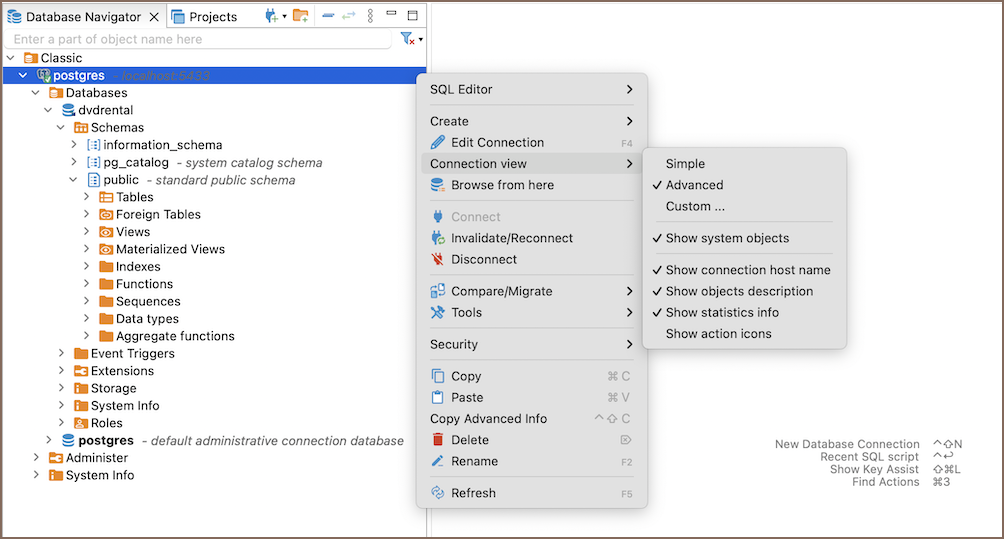 In addition to selecting a view mode, there are other settings accessible via the Connection view context menu. These settings provide additional information about the database objects and enhance your experience: