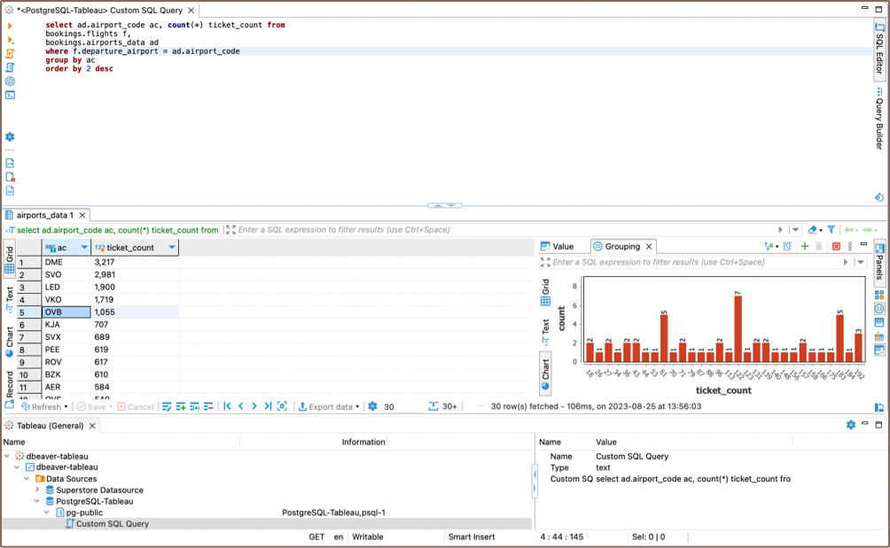 The SQL Editor will open, where you can work with the query just like any other query in Team Edition. You can make necessary changes, utilize grouping, filters, and other functionalities, and save and execute the query to see the changes reflected in Tableau.
