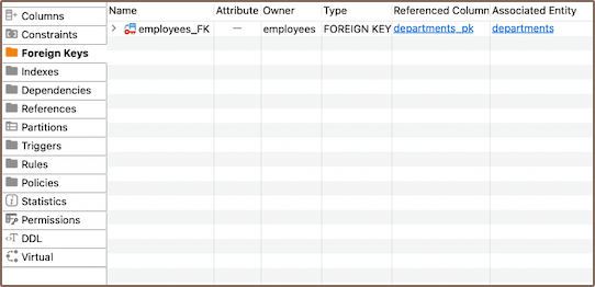 - Properties Editor: Open the Properties Editor by double-clicking on the table name. Within the selected table, you'll find a folder named Foreign Keys. Right-click on the foreign key you want to modify and select View Foreign Key.