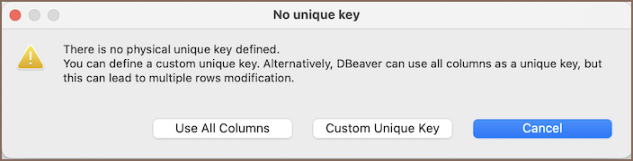 If you begin modifying data in a table that lacks a primary or unique key, Team Edition will alert you with the following error message: