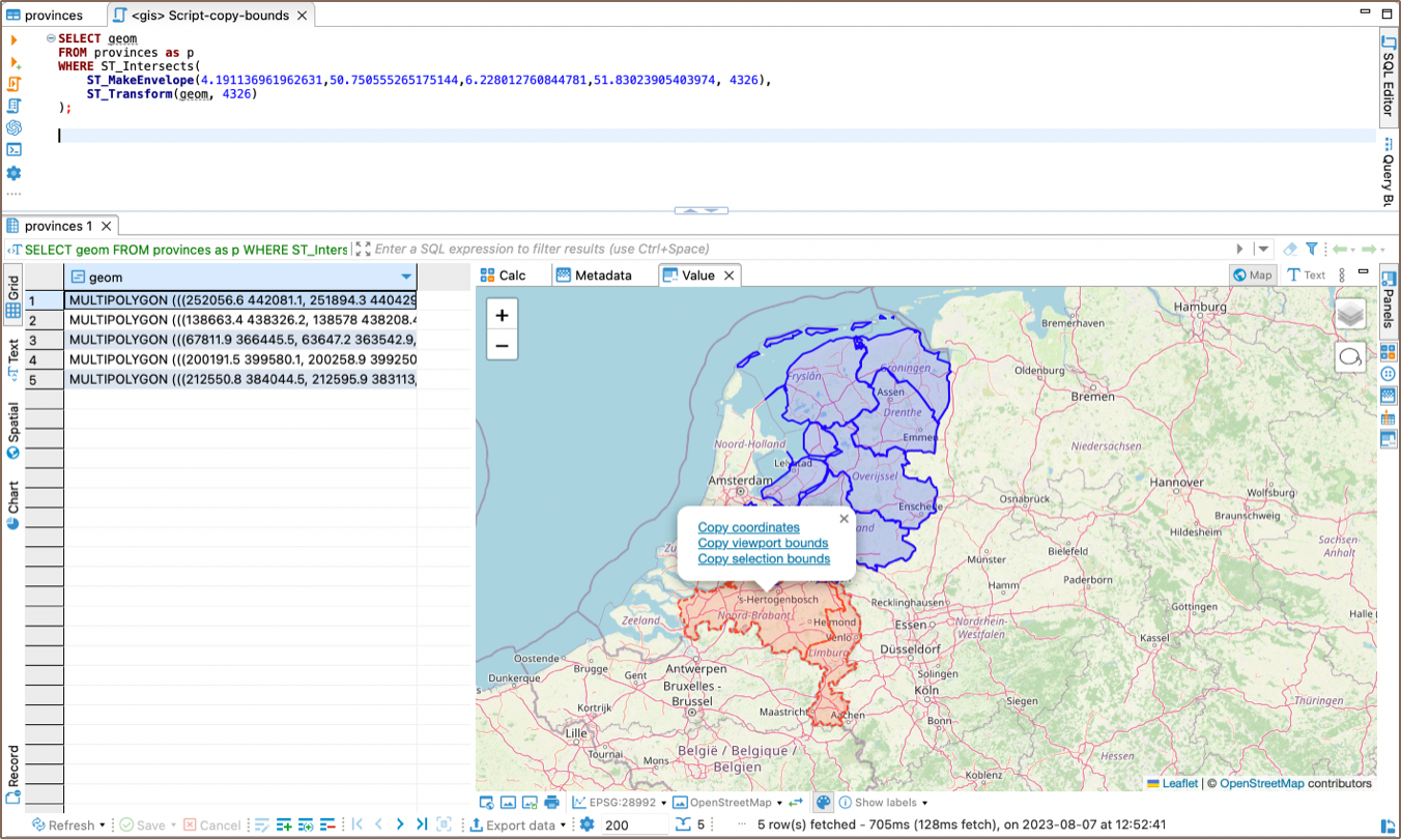 To use this feature, adjust the viewport to the area of interest using the zoom and drag functions. Then, select the Copy viewport bounds option. This action will copy the coordinates that represent the extent of the current view area. You can then paste these coordinates into your SQL query or any other place where you need to use them.
