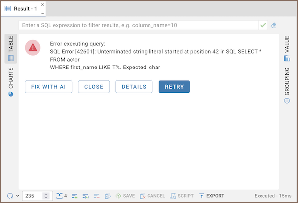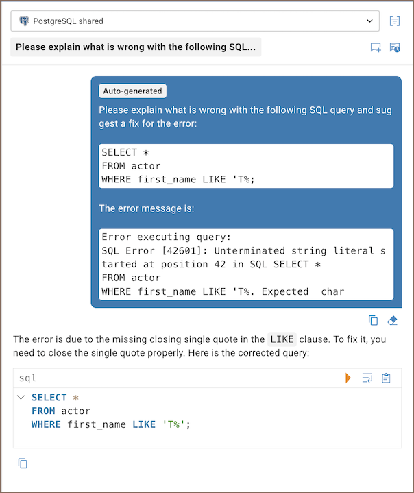 After running a query, if an error occurs, the Fix with AI button appears below the error message in the Results panel.