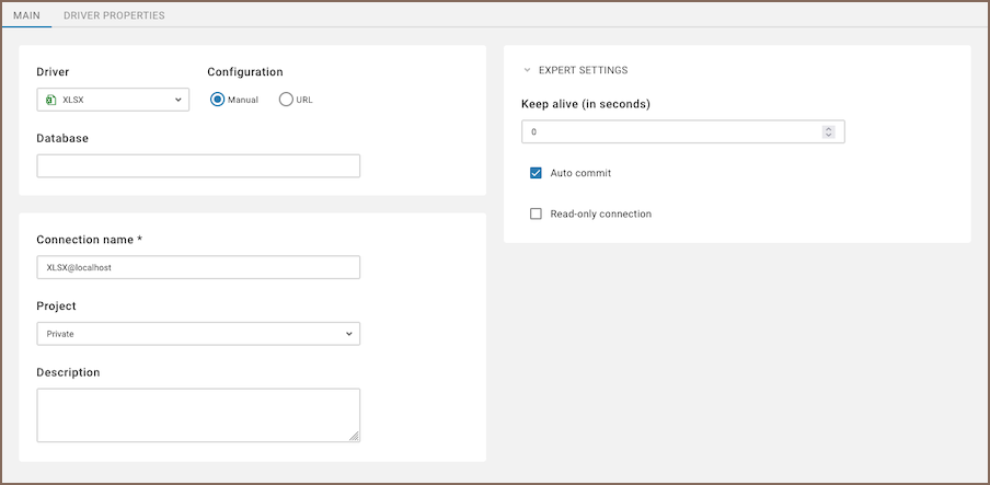 | Connection name | Enter a custom name for your connection. | Defaults to XLSX@localhost. |